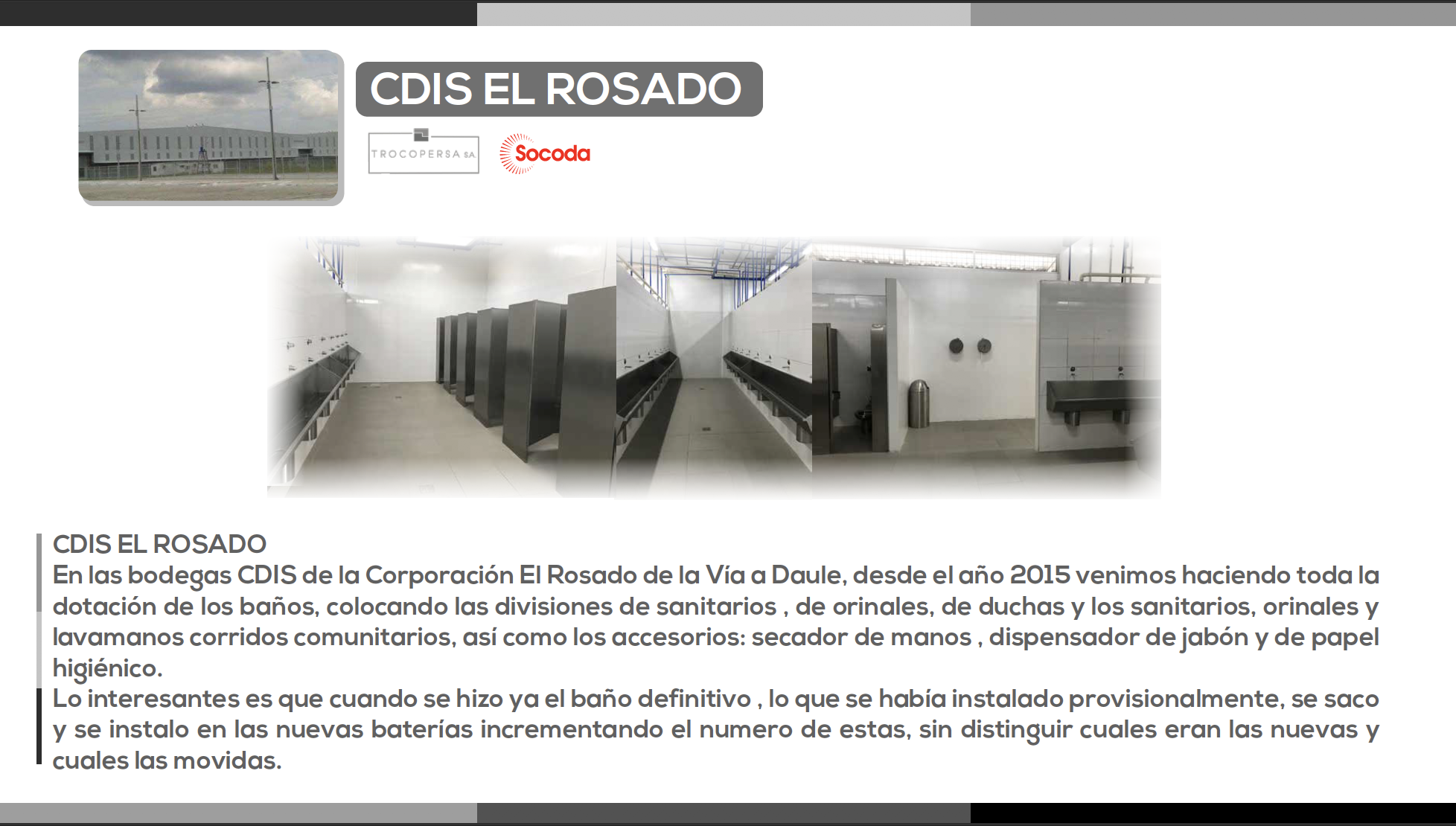 En las bodegas CDIS de la Corporación El Rosado de la Vía a Daule, desde el año 2015 venimos haciendo toda la dotación de los baños, colocando las divisiones de sanitarios , de orinales, de duchas y los sanitarios, orinales y lavamanos corridos comunitarios, así como los accesorios: secador de manos , dispensador de jabón y de papel higiénico.