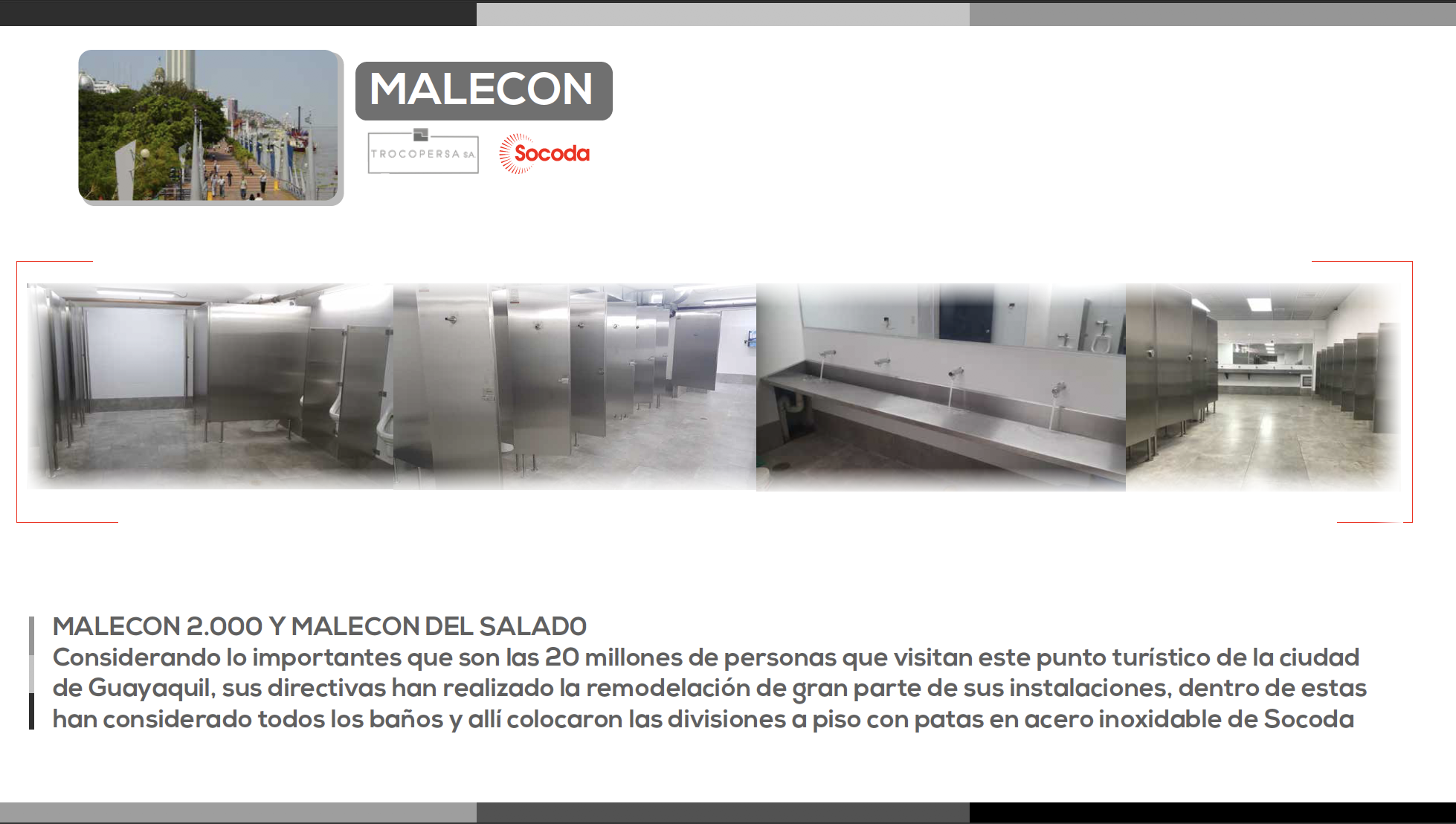 Considerando lo importantes que son las 20 millones de personas que visitan este punto turístico de la ciudad de Guayaquil, sus directivas han realizado la remodelación de gran parte de sus instalaciones, dentro de estas han considerado todos los baños y allí colocaron las divisiones a piso con patas en acero inoxidable de Socoda S.A.